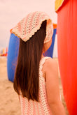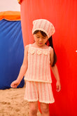 Crocheted headband in soft cotton yarn with an open weave pattern and scalloped edges. Light and flexible, it ties softly at the back or can be tucked in for a bonnet look. Adds a handmade touch to everyday outfits and helps keep hair in place.