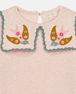 A soft cotton-cashmere knit with a storybook collar: two embroidered birds perched on square knit panels finished with a scalloped edge. The body has a textured seed-stitch, sleeves in delicate openwork, and neat rib trims; a keyhole button at the back slips on easily. Pair with denim, cords, or a tulle skirt for everyday play to birthdays. 95% cotton, 5% cashmere knit.
