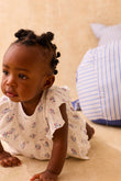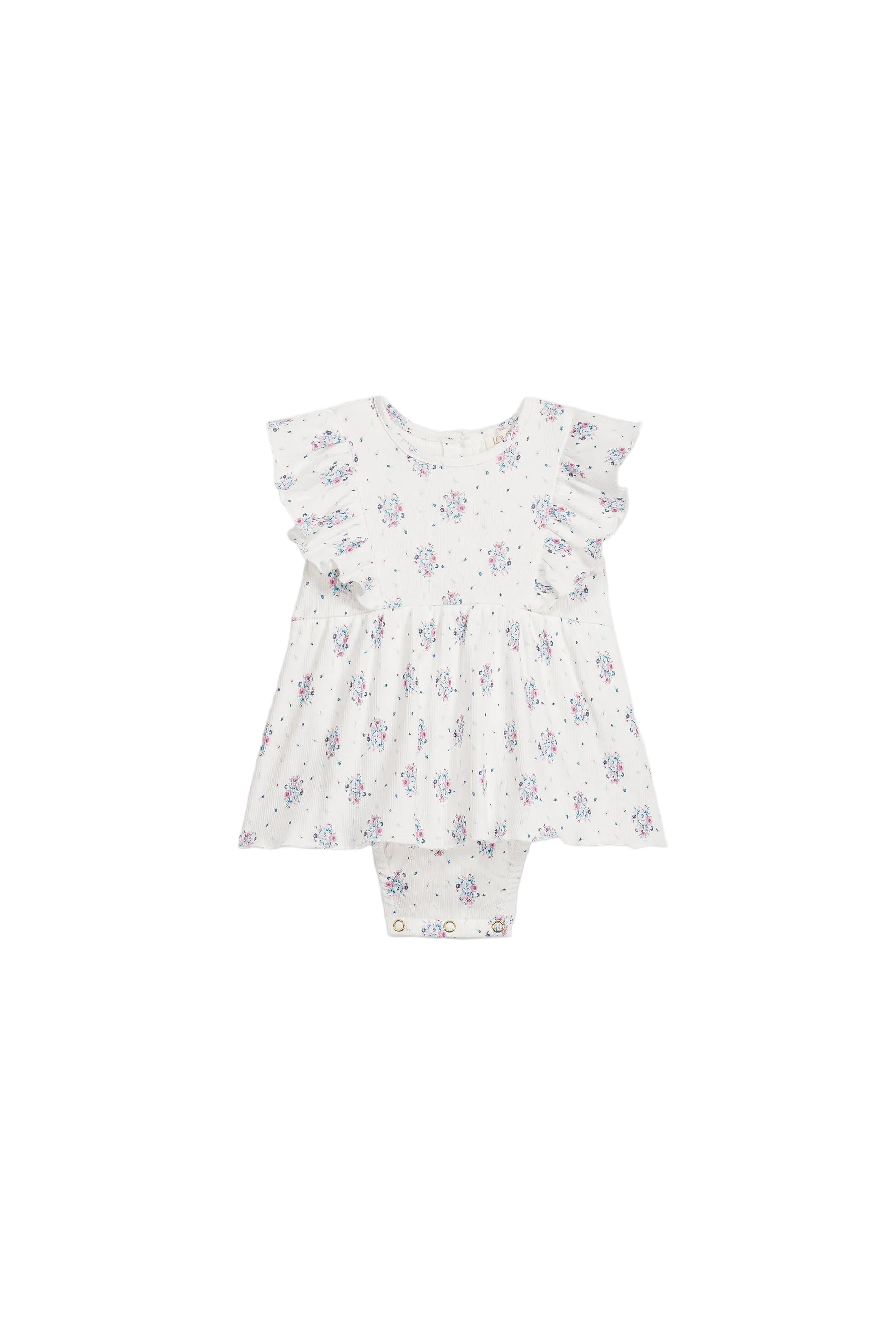 Lena romper in ribbed jersey with all-over floral print and ruffle sleeves. Designed like a small dress from the front, with a fitted body underneath for a secure fit. Finished with gentle gathers at the waist and snap buttons at the crotch for quick changes. Easy on its own in warm weather, or layered with leggings and a cardigan. Curated by CO LABEL for the soft rib feel and the ruffle detail that sits neatly under layers.