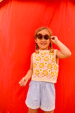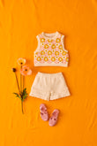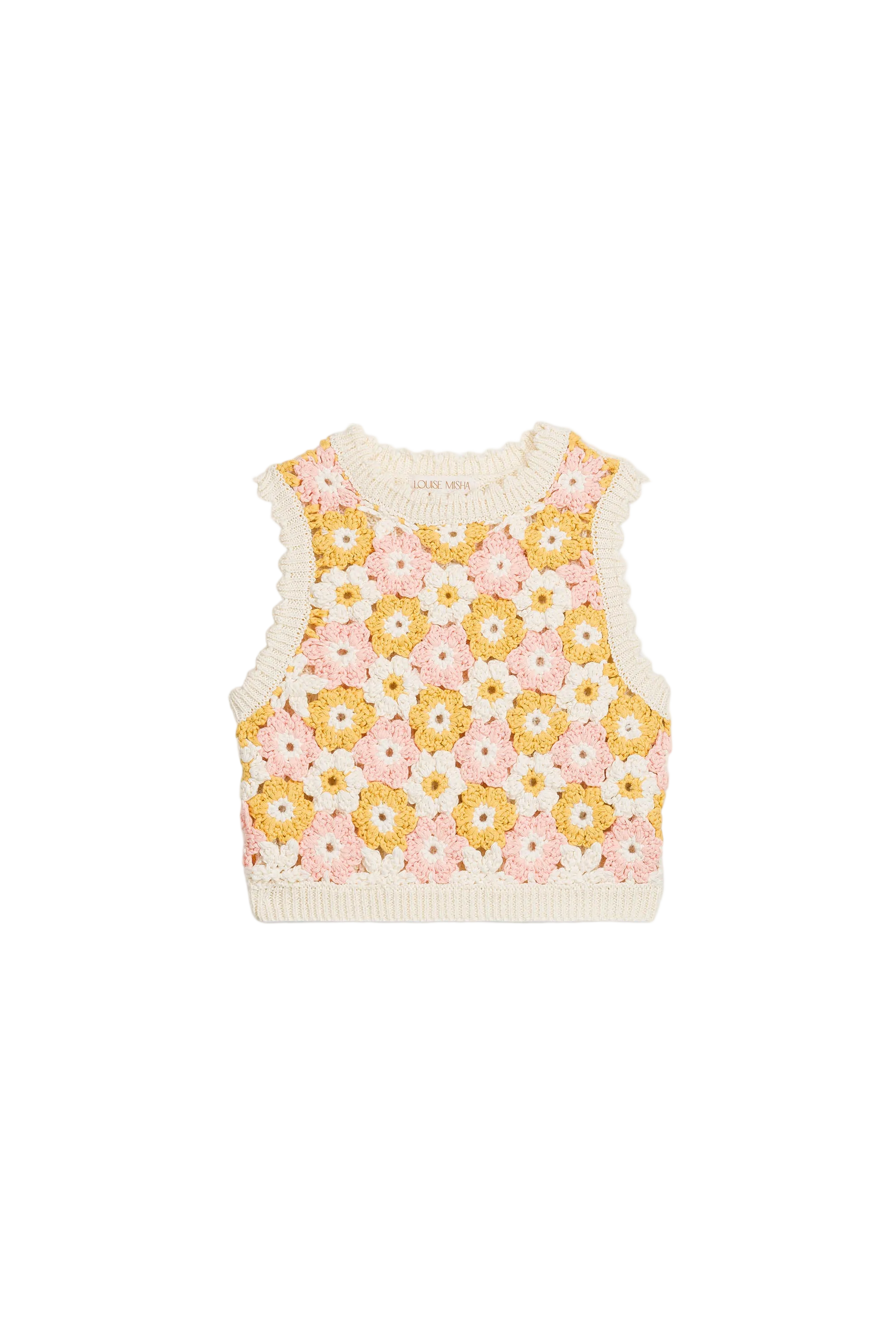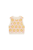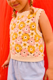 Rynia crochet knit top with flower motifs and ribbed trims. Sleeveless shape with a round neck and a straight fit that sits neatly at the waist. Finished with a soft, scalloped edge at the neckline and armholes, and a ribbed hem for structure. Wear it on its own with shorts, or layer over a tee for school days and weekends. Curated by CO LABEL for the handwork feel and the colour mix that lifts simple outfits.